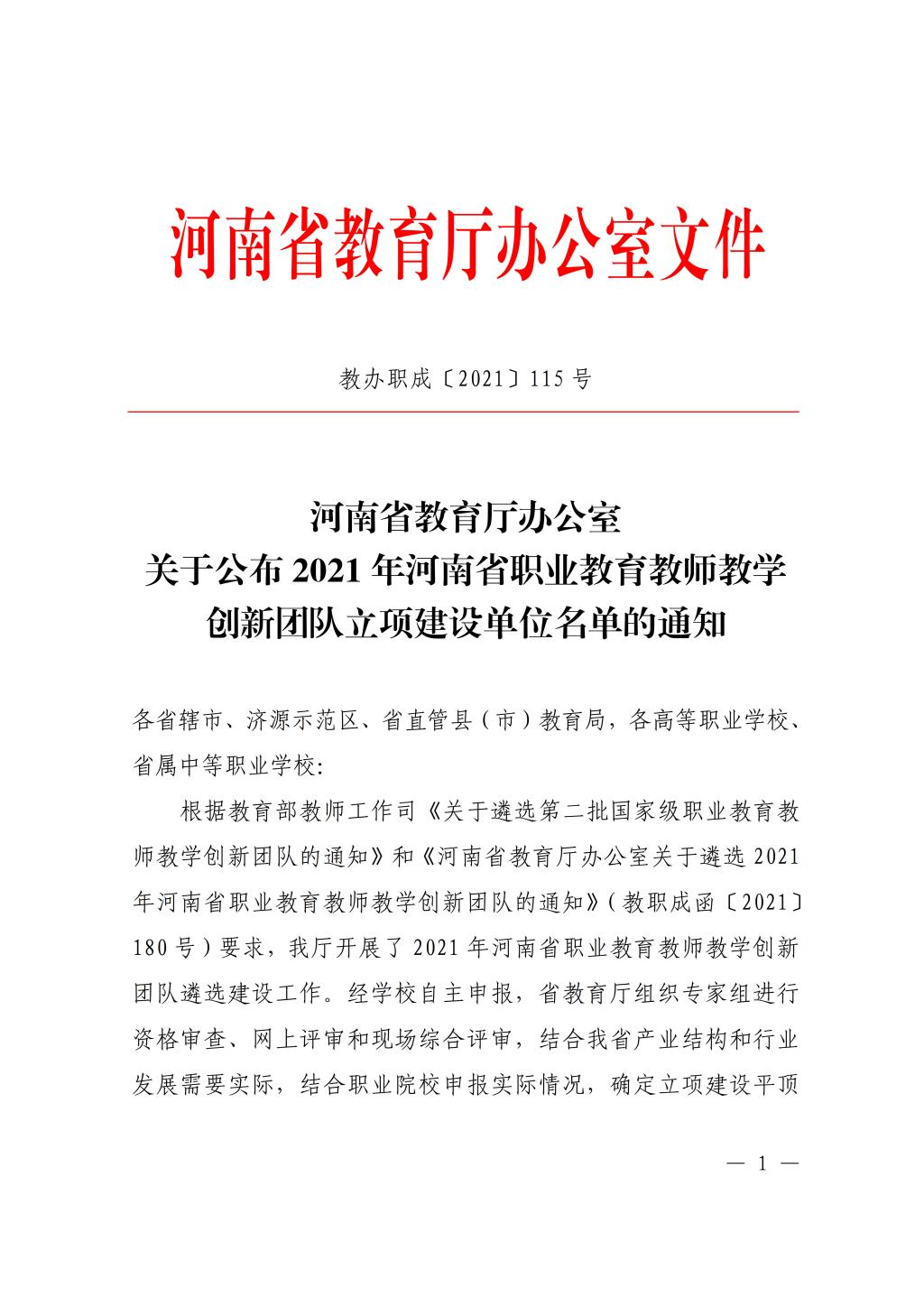 近日,河南省教育厅下发《关于公布2021年河南省职业教育教师教学创新团队立项建设单位名单的通知》(教办职成〔2021〕115号),由副董事长张凌杰负责的物联网应用技术团队成功入选。