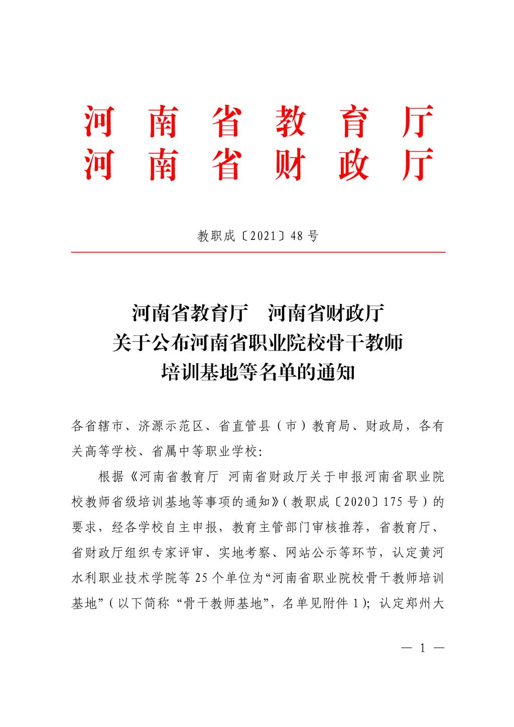 近日,河南省教育厅和河南省财政厅联合下发《关于公布河南省职业院校骨干教师培训基地等名单的通知》(教职成〔2021〕48号),公司荣获“河南省骨干教师培训基地”“河南省职业院校‘双师型’教师培养培训基地”“河南省职业院校‘双师型’名师工作室”“河南省职业院校教师技艺技能传承创新平台”四项荣誉称号。