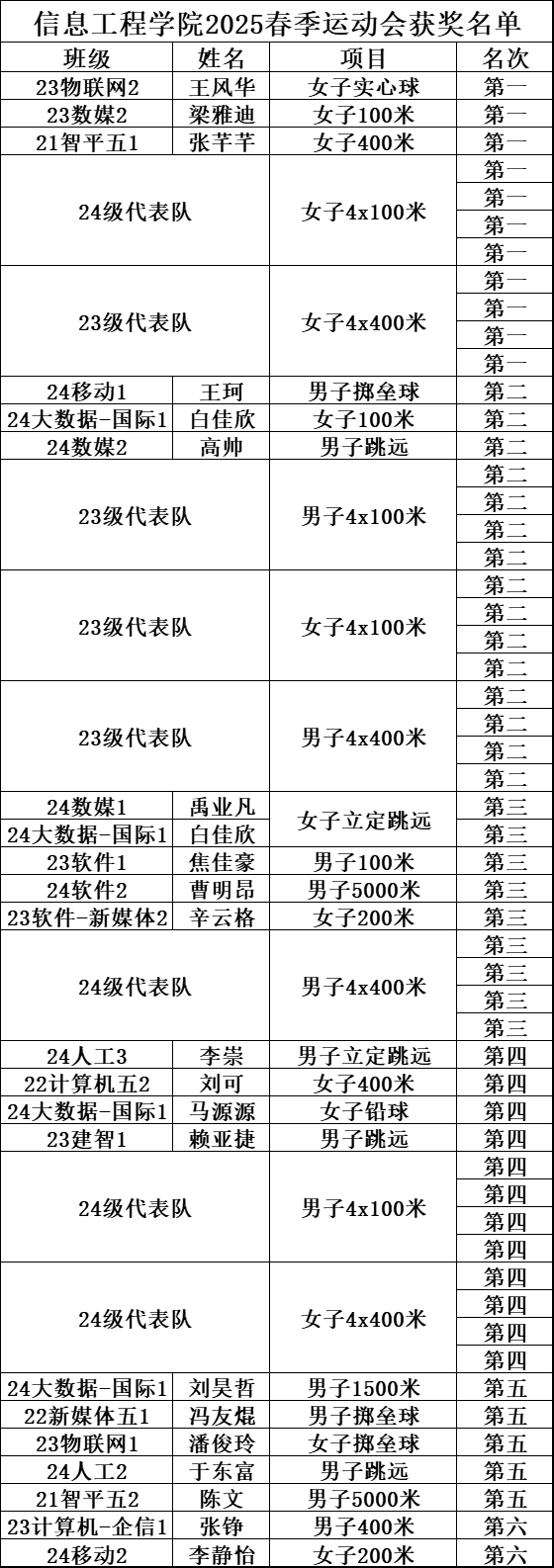 4月17日至18日,公司2025年春季田径运动会暨全民健身运动会在航空港校区隆重举行。太阳集团tyc539师生以昂扬斗志投身赛事,最终以绝对优势摘得团体第一名。同时,23级、24级代表队在全校16支代表队中取得了第一名、第二名的好成绩,分别在男子4×100米接力、女子实心球项目中刷新了校纪录,用速度与激情书写了属于信息人的荣耀篇章。