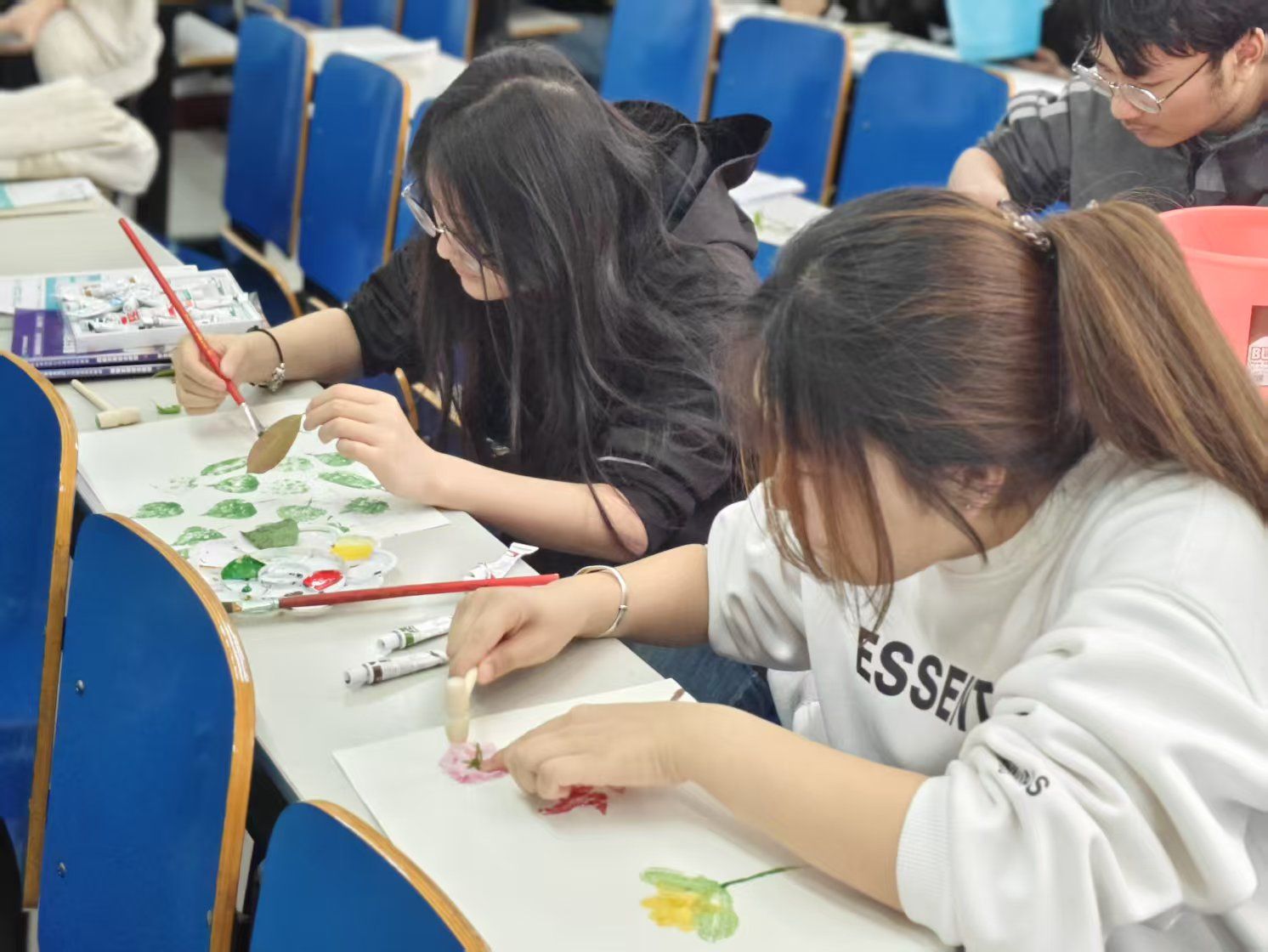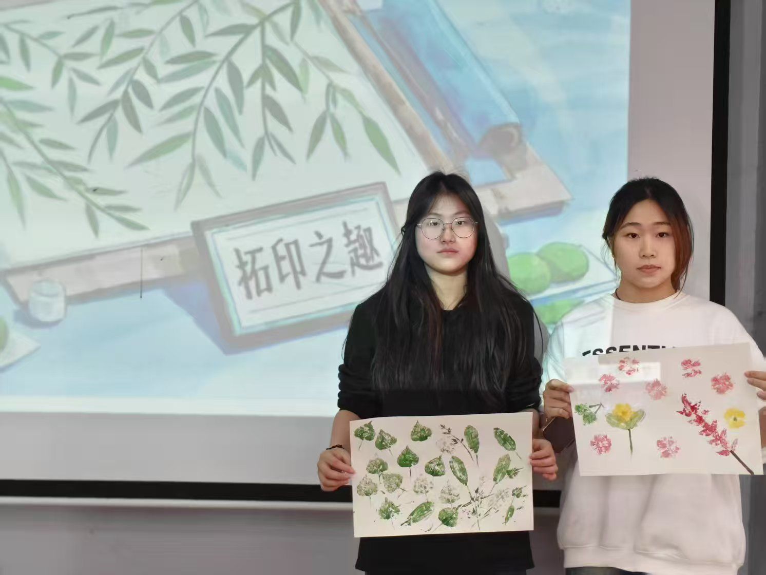 “春印自然,绿寄清明”植物拓印活动中,将传统非遗技艺与现代美育相结合,同学们将颜料均匀涂抹在植物表面,并通过精心设计、布局,将它们排列在纸张上,通过捶打拓印出独具特色的自然纹理使同学们在实践中感受传统智慧与自然之美。